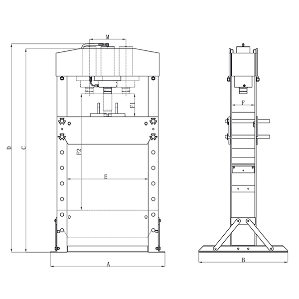 Ширина (А) Глубина (B)  Высота рамы(С) Общая высота(D)   Горизонтальное смещение цилиндра(M) Ход станины (F1-F2)  Ширина рабочего стола(Е)