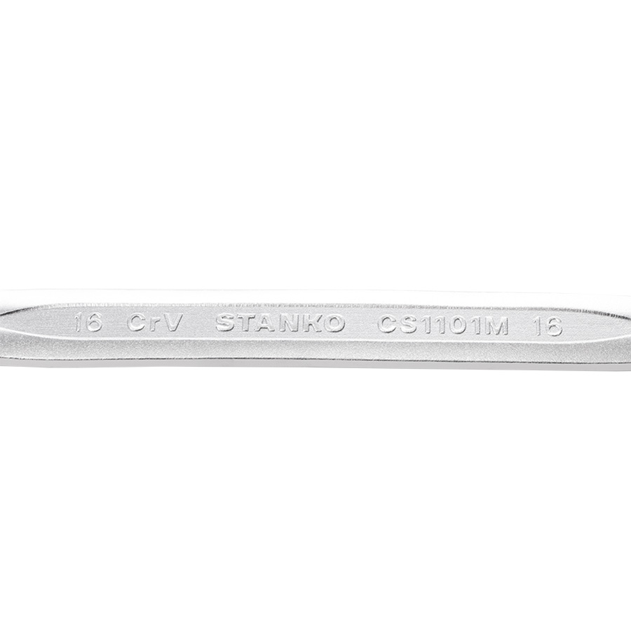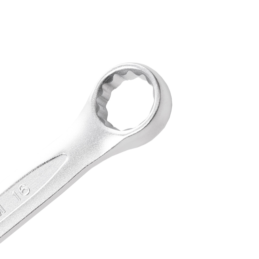 Финишная обработка Soft matt и хром никелевое покрытие комбинированного ключа обеспечивает надежную защиту от коррозии, а также надежный хват и препятствует выскальзыванию инструмента из рук. 12-гранный профиль накидной части подходит к головкам болтов и гайкам как 6-, так и 12-гранного профиля, и обеспечивает 5 градусный шаг перехвата. Специальный отгиб, в 15 градусов накидной части ключа позволит работать в местах с ограниченным доступом к крепежу и поможет подобраться к крепежу как с торца, так и с боку, в зависимости от места выполняемых работ.