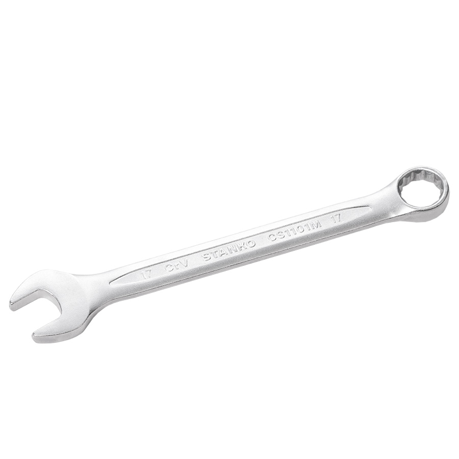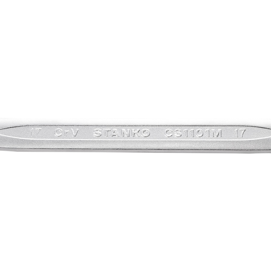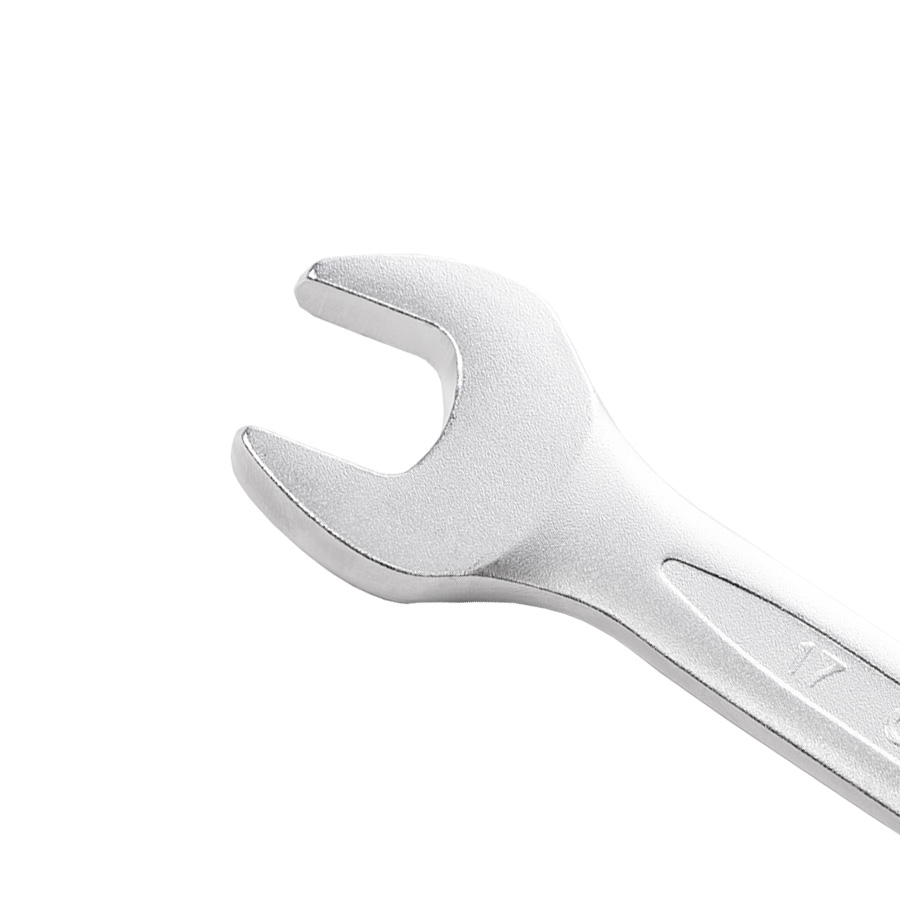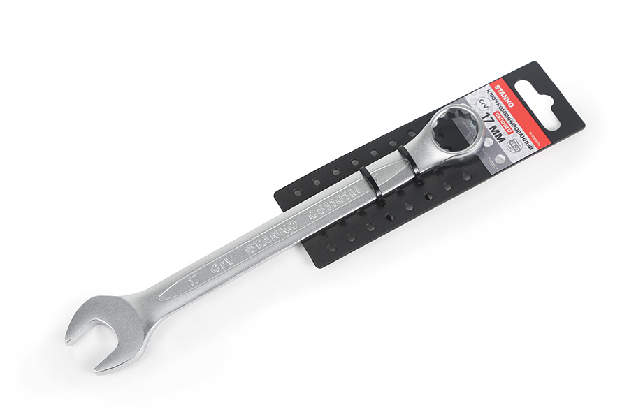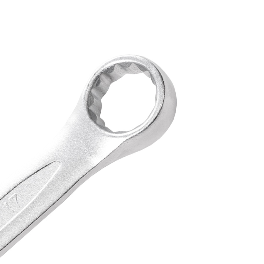 Финишная обработка Soft matt и хром никелевое покрытие комбинированного ключа обеспечивает надежную защиту от коррозии, а также надежный хват и препятствует выскальзыванию инструмента из рук. 12-гранный профиль накидной части подходит к головкам болтов и гайкам как 6-, так и 12-гранного профиля, и обеспечивает 5 градусный шаг перехвата. Специальный отгиб, в 15 градусов накидной части ключа позволит работать в местах с ограниченным доступом к крепежу и поможет подобраться к крепежу как с торца, так и с боку, в зависимости от места выполняемых работ.