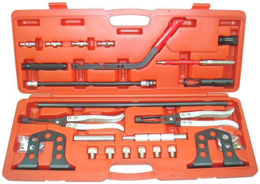 Набор включает в себя всё необходимое для снятия стопорных сухарей клапанов, а так же для снятия и установки клапанных пружин, а так же для снятия и установки маслоотражающих колпачков. Подходит для ГБЦ двигателей системы OHV, OHC, SOHC и DOHC (twincam).