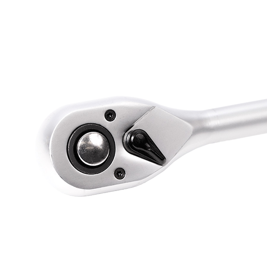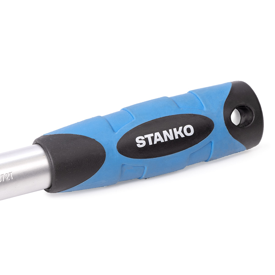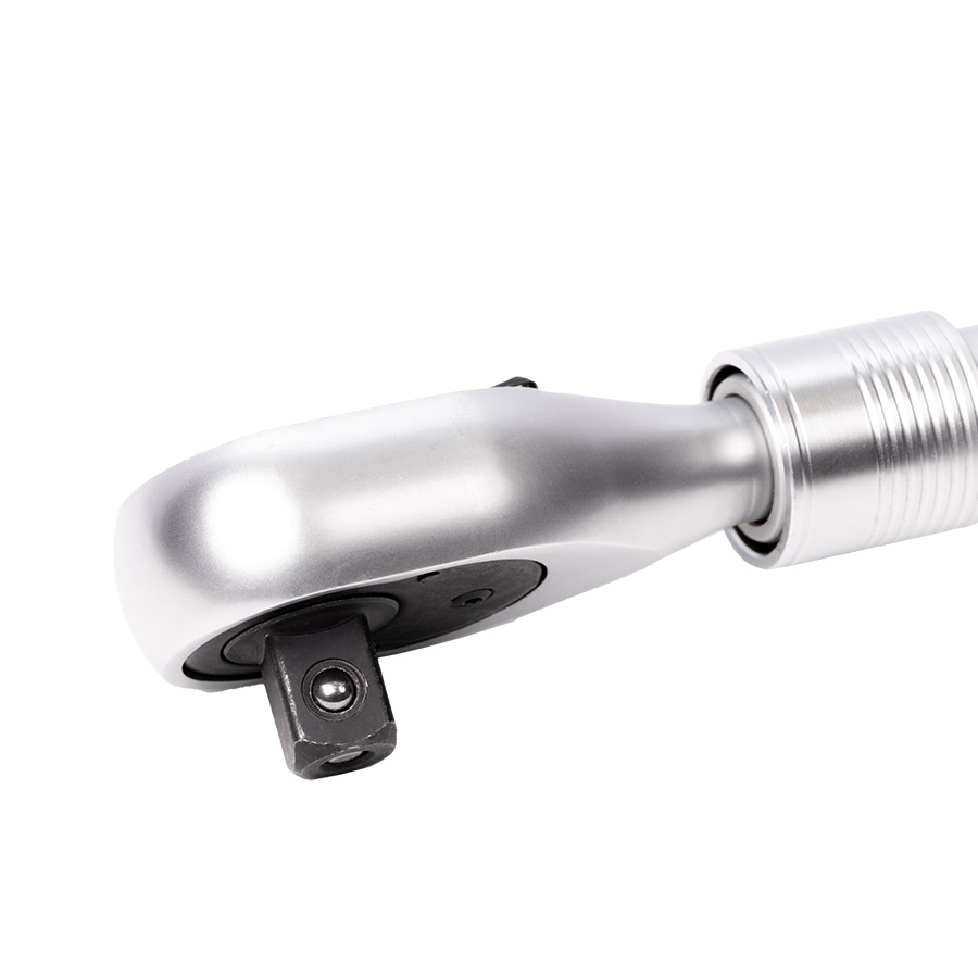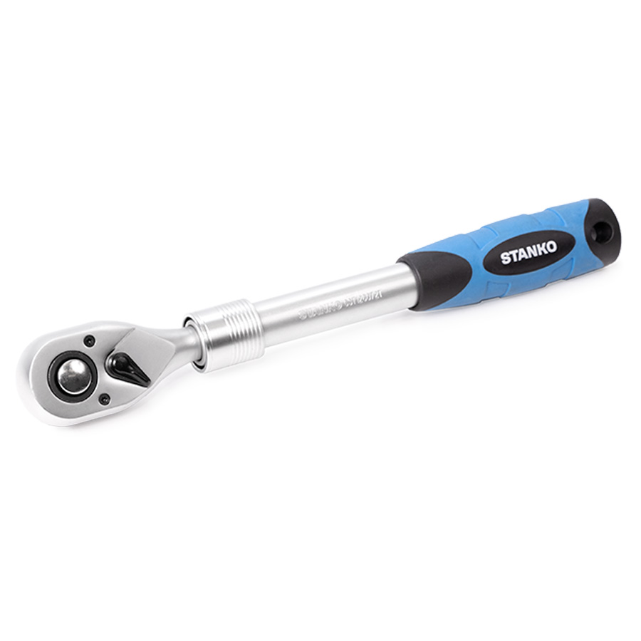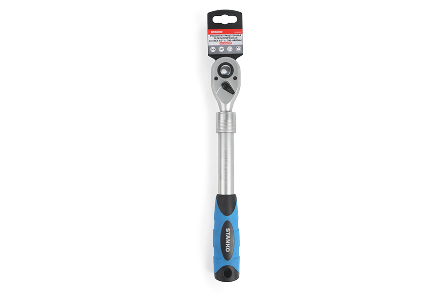 Трещотка изготовлена из высококачественной легированной хромованадиевой инструментальной стали, с последующей закалкой до твердости в пределах 46-48HRC, что обеспечивает оптимальное соотношение прочности и твердости. Эргономичная телескопическая рукоять обеспечивает надежное удержание инструмента и комфортную работу, а благодаря высококачественным компонентам рукоять обладает высокой стойкостью к агрессивным средам.